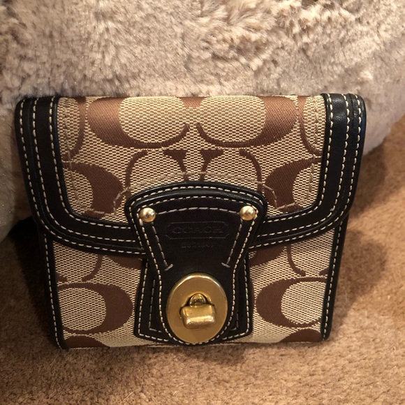 Bi-Fold signature wallet. Brushed gold twist lock closure. 100% leather interior. Eight inside slots and divided pockets for cash. Back zippered coin pocket.