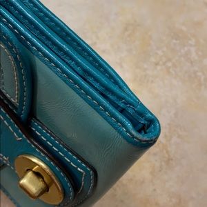 Lovely. Multi-tonal genuine leather... aqua and teal blues. Brass hardware, fully functioning turn clasp. Lots of card/ID pockets and cash storage. Zip pocket on rear.