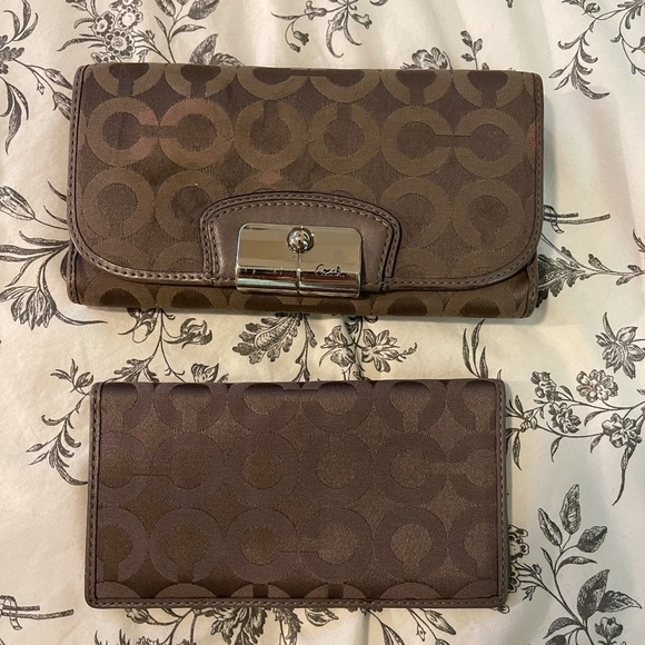 Grey Coach wallet with expanded pockets for cards, zip change purse on back, & checkbook holder.
