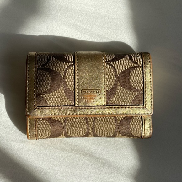 Used, authentic Coach wallet! Gold/Bronze tones. Has discoloration on the front and edge- as seen in photos.