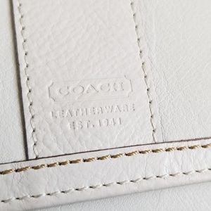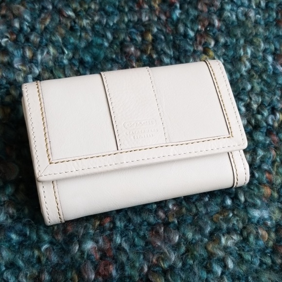 Adorable Coach mini wallet! Gently used a few times but in excellent condition. Off white with some light tan top stitching. Change compartment on one side with room for cards and the billfold on the other. Coach signature lining inside. One very small mark shown in the last picture. Measures about 3 1/2"×4 1/2" × 1 1/2" when closed.