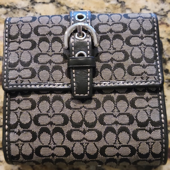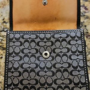 1970s vintage Black and grey Signator wallet by coach. In normal vintage used condition with no rips no tears. Large coin keeper pocket on back. Flapsnap closure. 6 credit card slots two full-length dollar bill slots.