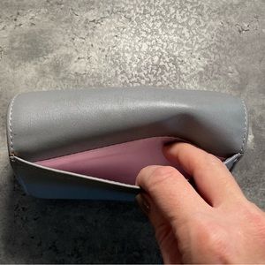 Grey exterior with pink lining on interior pockets. Lightly used.