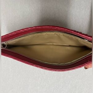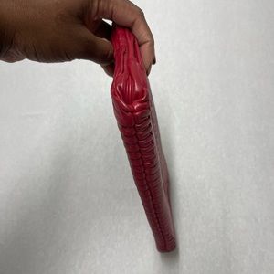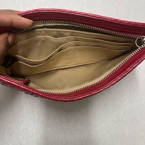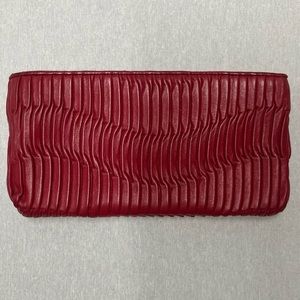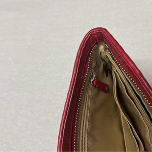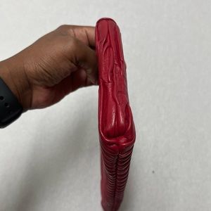 Coach Wallet. Color red. Authentic. Embossed logo on front. Purchased new from Coach. Genuine leather. Color black. Includes Gently used. Included 6 card slots inside as well as zipper pocket. Used. No damage to outside stitching. Silver hardware. Free of odor. Stored in a smoke free and pet free environment.