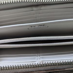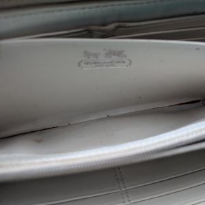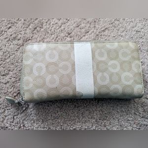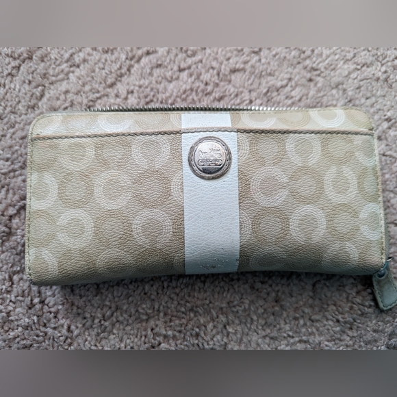 Coach wallet. Has minor wear which is shown in pictures. Multiple storage compartments and a full zip to close. Could carry like a clutch or wristlet. Wear shown in pictures.