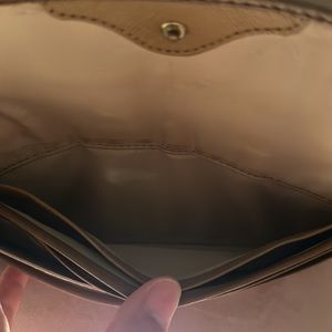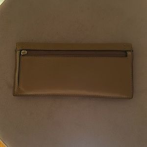 Coach Leather snap close long wallet. Brown tan leather four card slot , two dollar slot compartments and one zipper back pocket.