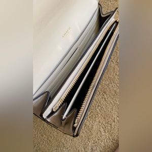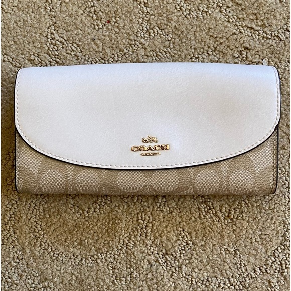 Coach Wallet, colorblock design, white and tan coloring, gold hardware, zipper compartment, multiple card holding slots, never used, excellent condition