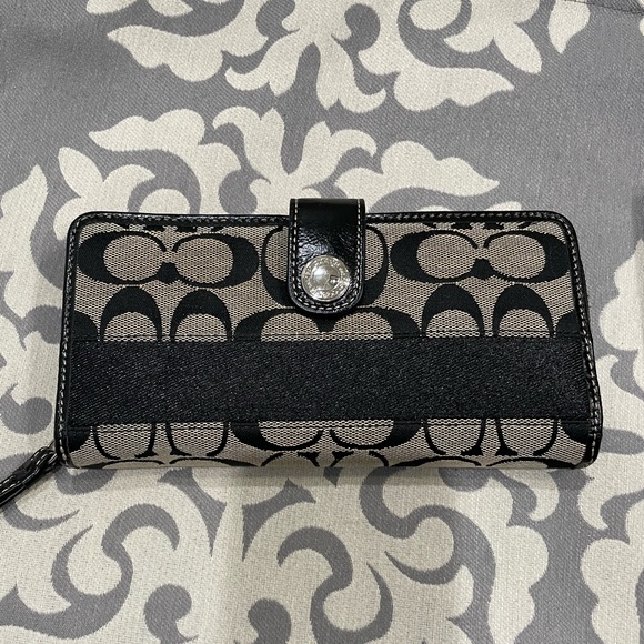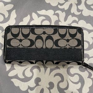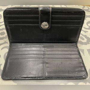 Well loved coach wallet. Black coach detail fabric with leather interior. Has a great amount of card storage and nice back zipper for cash/change.