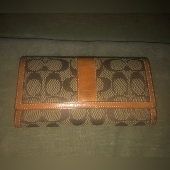 Long trifold coach wallet. Signature khaki, monogram fabric. Vachetta leather, trim and inside.