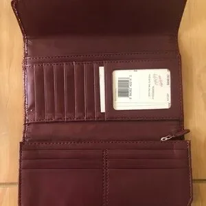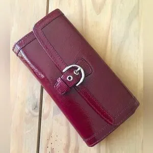 Crimson colored Coach wallet with silver buckle. Very lightly used. Retailed originally $238, purchased for $149.99. Tag in inside photo. Noticed the interior is damaged along edges, will sell for best offer