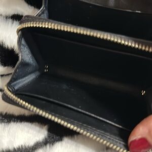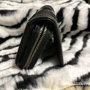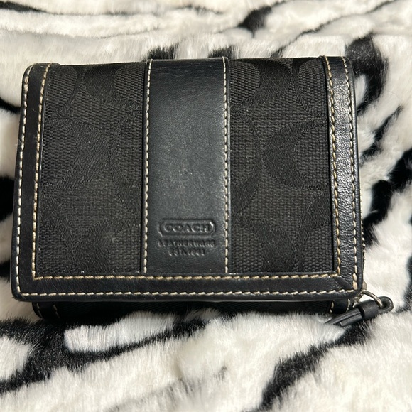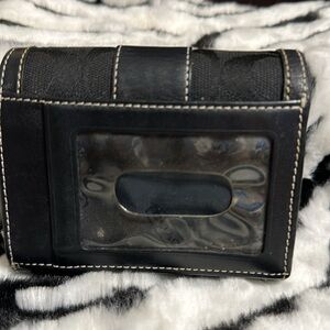 Coach wallet.. in black signature with black leather trim. Outside ID, inside zipped coin section, 3 debit/credit card slots..2 additional sections. Small wallet.. great for crossbody bags.