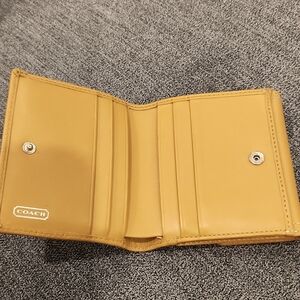 *EUC* Timeless elegant Coach billfold wallet in tan leather with 6 card slots, 2 bill slots and clip closure coin pocket. Its compact design and premium craftsmanship make it a stylish choice for any occasion.