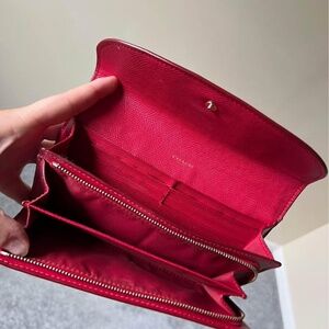 Red and Brown button closure wallet by COACH. 12 card slots, a zippered coin section, and pockets long enough for check books. Gently used, no signs of wear and tear.