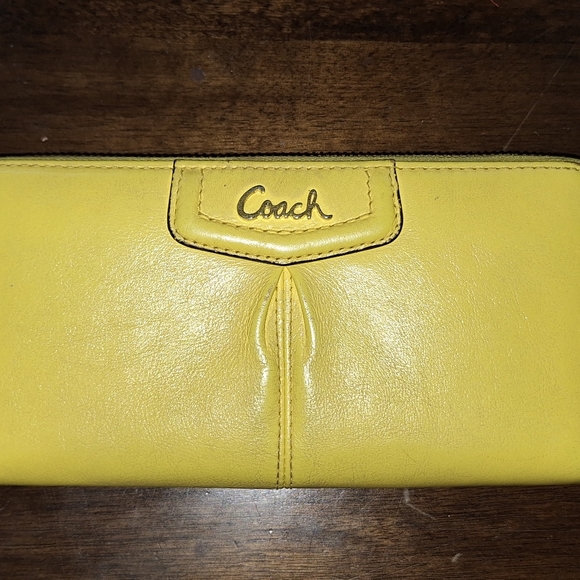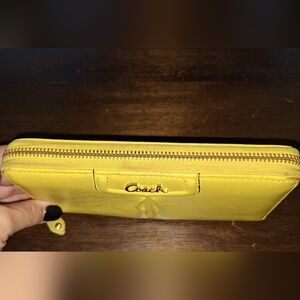 Yellow leather Coach. Still in good condition, but looks worn on the canvas by the zipper. There's darkening shown in the pictures.