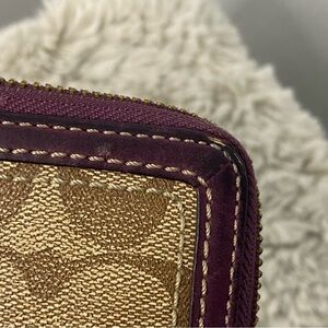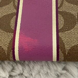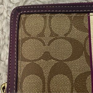 Elegant Coach wallet with a tan and purple design. Ideal for keeping essentials organized. Has 12 credit card and compartments. Has small discoloration in the back of wallet. Please see pictures. Great wallet.