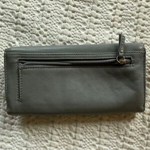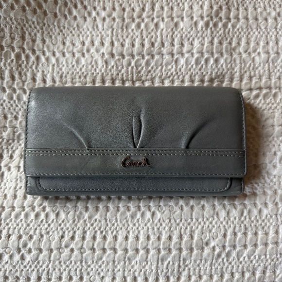 Gently used gray coach wallet. A little discoloration and a small pen mark inside, otherwise in good condition.