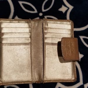 A must have for any collection! Gold color with a leather inside and vinyl outside. 8 card slots and two side pockets for cash.