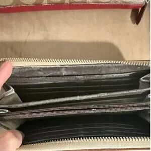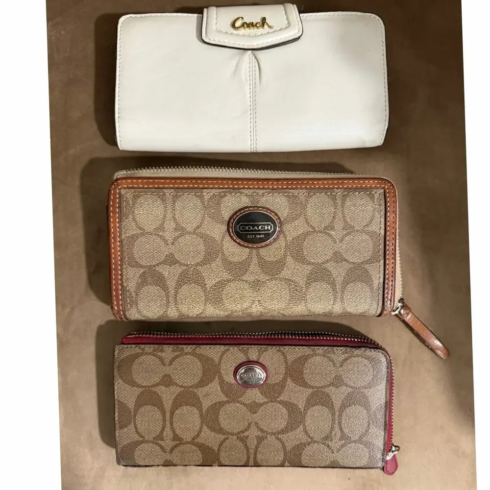 Coach wallet bundle. First one is an all white wallet - some wear on inside (view pictures). Second brown and orange/tan lining, inside has some wear. Third brown and red with red interior with some wear. Feel free to make a reasonable offer, no tears or holes.