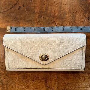 Coach wallet. Cream with gold tone hardware. Interior has slots for 8 cards. Exterior has zipper pocket on backside and slim pocket on front under clasp.