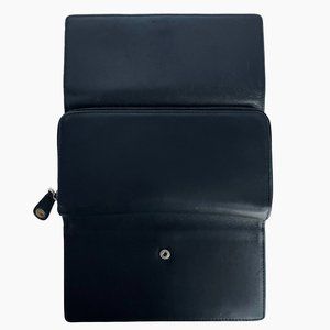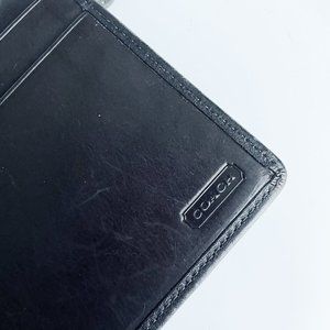 Authentic, preowned, vintage Coach wallet, likely made in the early 2000s. Made from black leather, it features a zip around section with large pouch on one side and a trifold snap section on the other side. Inside, there's 6 card slots with ID holder, three slip pockets and a pen holder. A larger size wallet that holds a bunch!