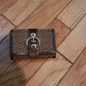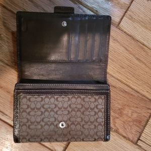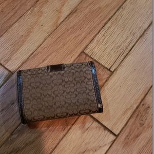 Coach Wallet Trifold Signature Brown Leather Trim Interior Button Shut Authentic