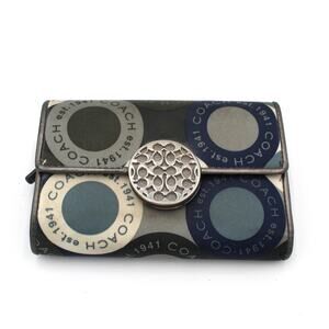 Coach Y2K trifold wallet with silver logo medallion snap closure. Features gray and blue circle print fabric with leather trim, multiple card slots, bill compartments. Soft fabric exterior, classic Y2K design, and perfect everyday size.