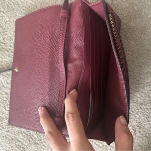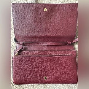 In excellent condition. Maroon color. Can be worn as just a wallet or wallet on chain.