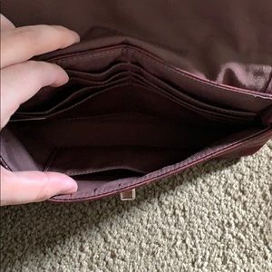 Authentic. Deep plum/burgundy color. Has 8 card slots and pocket on the back. Stains on back.