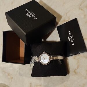 From COACH, the Cary watch will keep your valuable time while adding some dazzle to your style. Featuring a 26mm stainless steel case and bangle bracelet, this remarkable timepiece is resilient with water-resistance up to 30 meters. It is powered by a quartz movement, and the white mother of pearl dial exhibits coordinating silver-tone hands and Arabic numerals. The COACH signature and iconic horse and carriage motif detail the dial and bracelet, stamping the watch with the house's heritage touch.