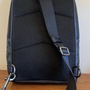 The Coach west Pack Bag Sig Varsity Stripe Blue NWT Signature Charcoal is a stylish medium-sized backpack designed for men. Made from leather with a solid pattern in black color, this bag features a zip closure and a fabric lining. The bag has a width of 14 inches, a height of 13 inches, and a depth of 3 inches. It is a designer piece from the year 2020-2029, with a sleek leather handle/strap for easy carrying.