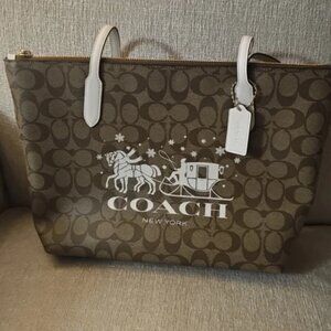 Enjoy a whimsical ride through the season with this Coach shopper, featuring a charming skeleton carriage. It’s spacious interior makes it perfect for all your shopping endeavors.