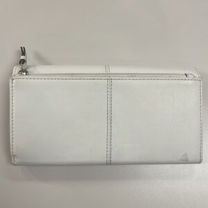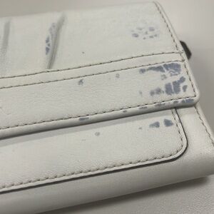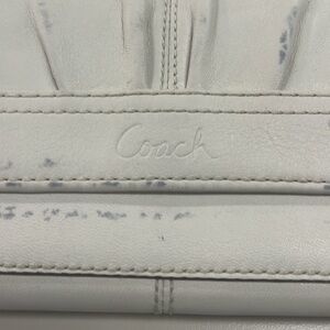 This Coach wallet, crafted from premium white leather, showcases a minimalist design with subtle stitching details. Its sleek, rectangular shape offers a timeless appeal, making it a versatile accessory for any occasion. There are ink transfer stains on outside of wallet. I tried to clean off with leather cleaning wipes. Please see all pictures. Condition taken into account with price listing. From a smoke and pet free home.