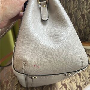 This Coach satchel features a sophisticated white, tan, and black color scheme, crafted from high-quality materials for a timeless look. Its structured design and medium to large size make it a practical choice for everyday use, while the elegant lines and subtle texture add a touch of luxury. In good shape, has some marks, see photos for condition. Wallet is included, doesn’t seem to have as much wear as the bag.