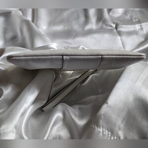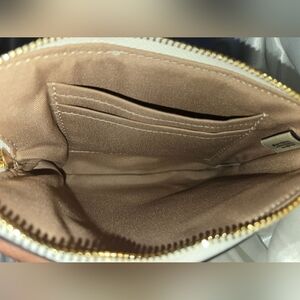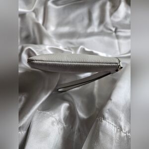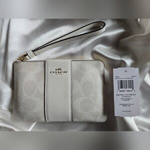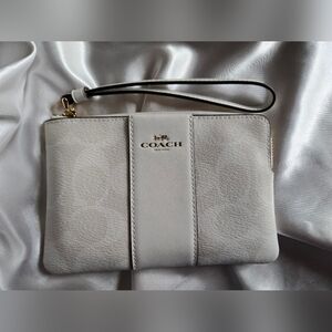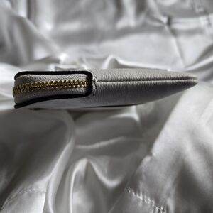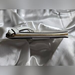 Elegant white wristlet clutch. Features gold-tone logo and accents. Sleek design with detachable strap.