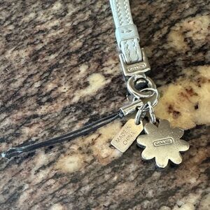 Chic Coach Phone Charm in white. Adorned with an orange flower charm.