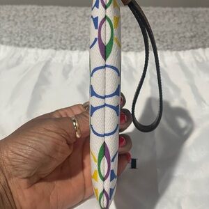 Stylish Coach wristlet with colorful logo pattern. Features a gold logo accent.