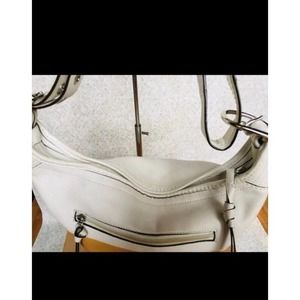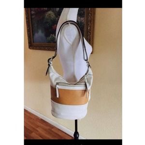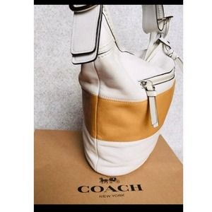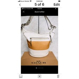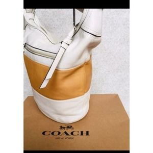 Stylish Coach shoulder bag. Features white and tan color block design. Front zipper pocket. Adjustable strap.