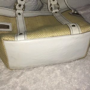 12" by 10" tote. White leather . Straw weave. The leather needs slight cleaning. Leather all in tacked and so is stitching. This was only worn/used for a week.