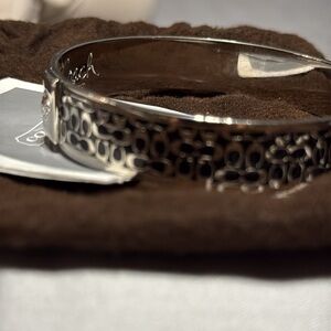 Chic Coach bangle in silver tone and black enamel. Simple and stylish design. Gifted approximately 12 years ago and never worn. Too large for my wrist. It’s been in its bag since.