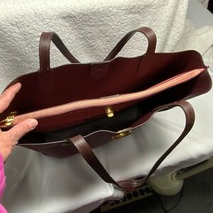 * Interior has 3 main sections: front section opens with turnkey inside the letter 'C', back opens with magnetic snap and he Middle section has zipper opening, is padded (for laptop) and lined with pink fabric