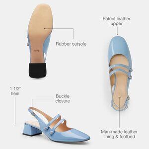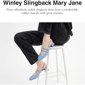 Coach Winley Mary Jane Slingback Pumps Women's Size 8 Bluebell Patent Leather. Crafted of high-shine patent leather, this two-strap slingback Mary Jane is a classic silhouette featuring enamel buttons detailed with our Signature for a heritage touch. The Winley is finished with a rubber outsole for great traction, man-made leather lining, leather footbed, buckle closure, and 1 1/2" heel