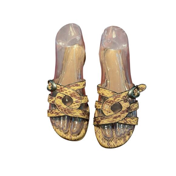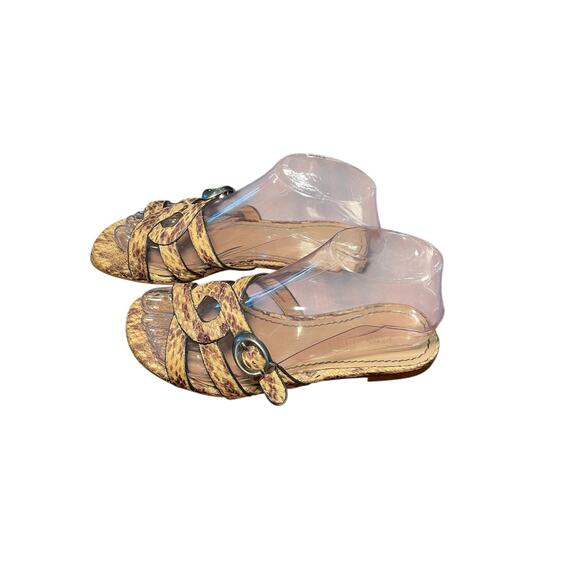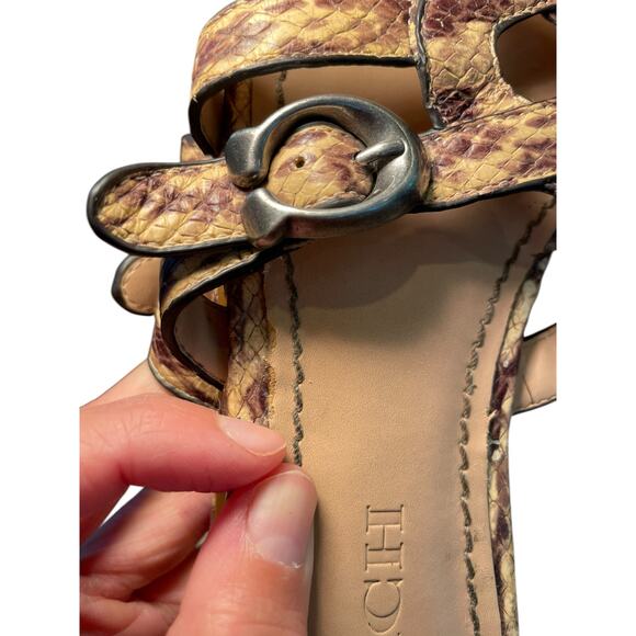 Coach Women 6 Kennedy Leather Snakeskin Slide Sandals Brown & Silver Coach Monogram C Buckle. Beautiful statement piece from Coach. Flat slide sandals. These shoes are preloved with signs of wear. Please see photos. Wear includes wear to the bottom of the shoes, the toe area where it's been scuffed, the edges of the straps and normal wear on footbed.