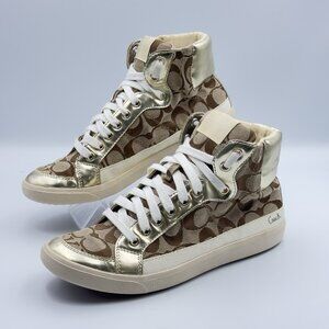 Coach Women's 8 Gold Signature C Logo Monogram High Top Canvas Sneakers