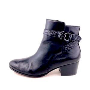 The Coach Women's Black Leather Paulina Booties are a stylish and sophisticated footwear choice, perfect for adding a touch of elegance to any outfit. These booties feature smooth black leather with a sleek almond toe design, offering a timeless and versatile look. Some versions include snake-embossed belting for added texture and detail.