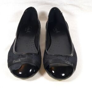 The flats are in good condition and show little wear on the foot bed and a small mark on the toe.