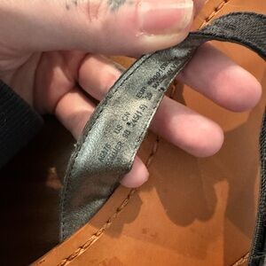 Elegant Coach sandals with black fabric straps and tan leather footbed. Ideal for summer wear.