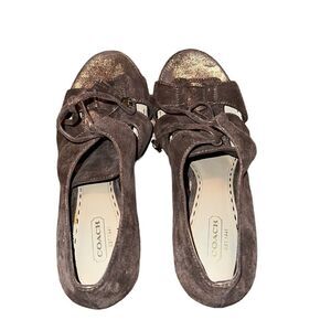 Step out in style with these elegant brown open-toe shoes from Coach. Perfect for any occasion, these shoes offer style and sophistication. The heel is 5 inches with a 1.25 inch platform. Beautiful shoes in great condition. I purchased them on poshmark, and they're just too high for me so I'm relating in hopes of finding them a new home. My loss is your gain.