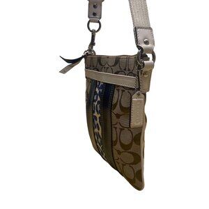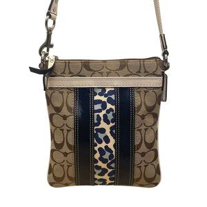 Compact coated canvas bag features Coach's iconic "C" pattern with stylish leopard and stripe accents. Includes a zip closure, adjustable crossbody strap, and slip pocket.