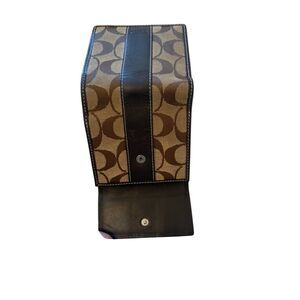 Coach Womens Brown Signature C Logo Leather Canvas Card Snap Bifold Wallet Small