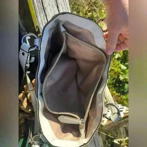 Some light stain marks that are shown in the pictures. Very hard to see. This bag is in good condition for its age! No rips or tears.